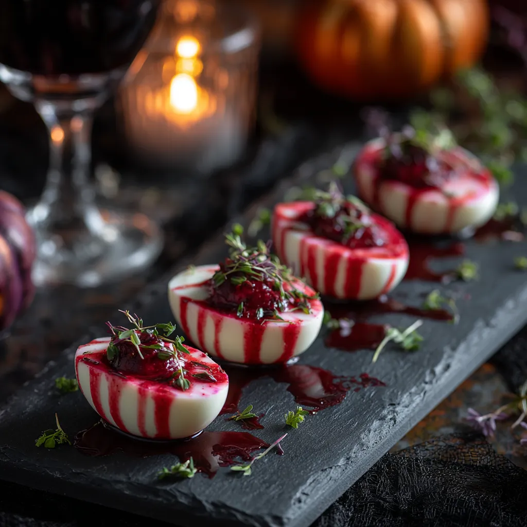 Top with fresh herbs like parsley or dill for a contrast of green against the deep red filling. You can even drizzle a bit of beet juice over the eggs for extra “bloody” flair. Arrange on a platter and serve chilled.