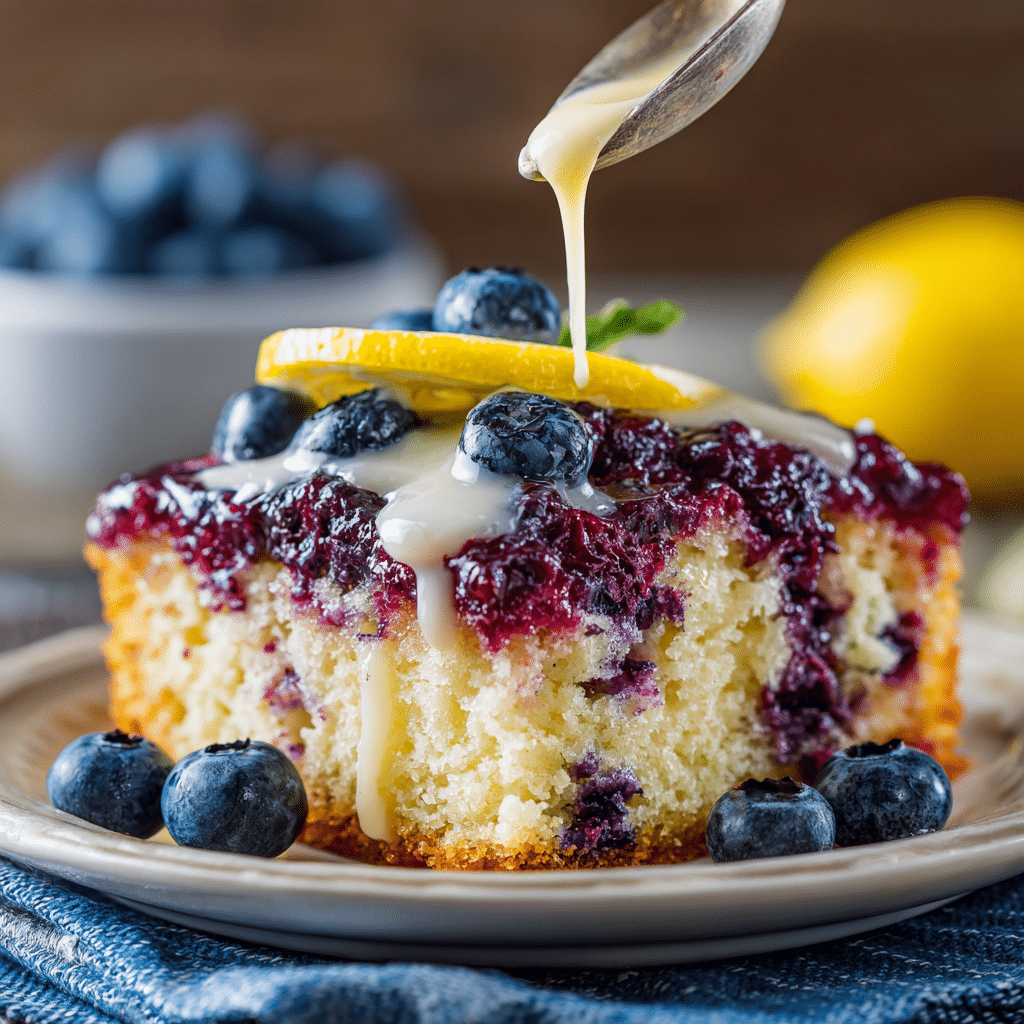 I bake a soft vanilla cake and poke holes all over it while it’s still warm. I dissolve blueberry gelatin in hot water, mix in cold water, and slowly pour it over the cake so it seeps inside. I chill the cake until the blueberry layer sets. Then I whisk powdered sugar, fresh lemon juice, and lemon zest to create a bright glaze. I pour the glaze over the chilled cake and let it set before slicing. The result is a moist, vibrant dessert bursting with berry and citrus flavor.
