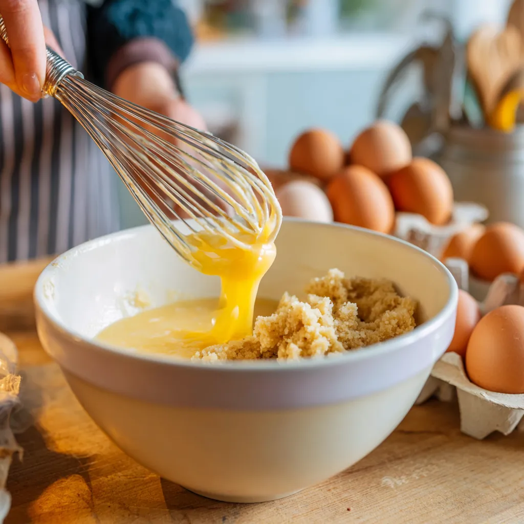 In a large bowl, whisk together the browned butter, dark brown sugar, and granulated sugar until smooth and glossy.