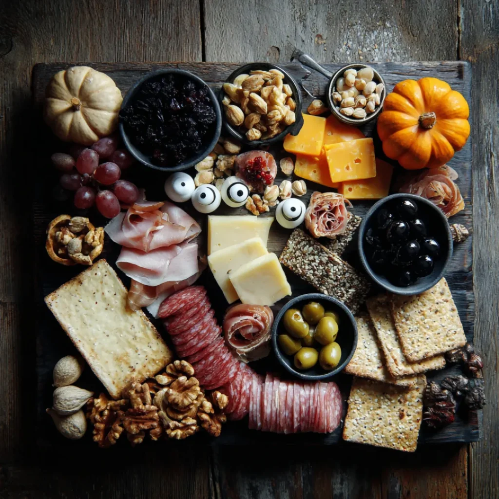 - Cheeses: Brie wheel, cheddar cubes, gouda slices, mozzarella balls (“eyeballs” effect if you add olives)