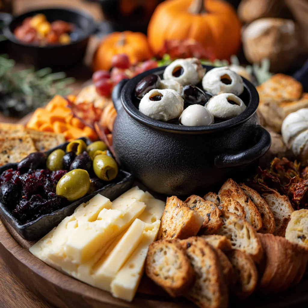Start by placing the cheeses around the cauldron. Cut some into cubes, leave some whole, and roll others for variety. Add olives to mozzarella balls for spooky “eyeballs.”
