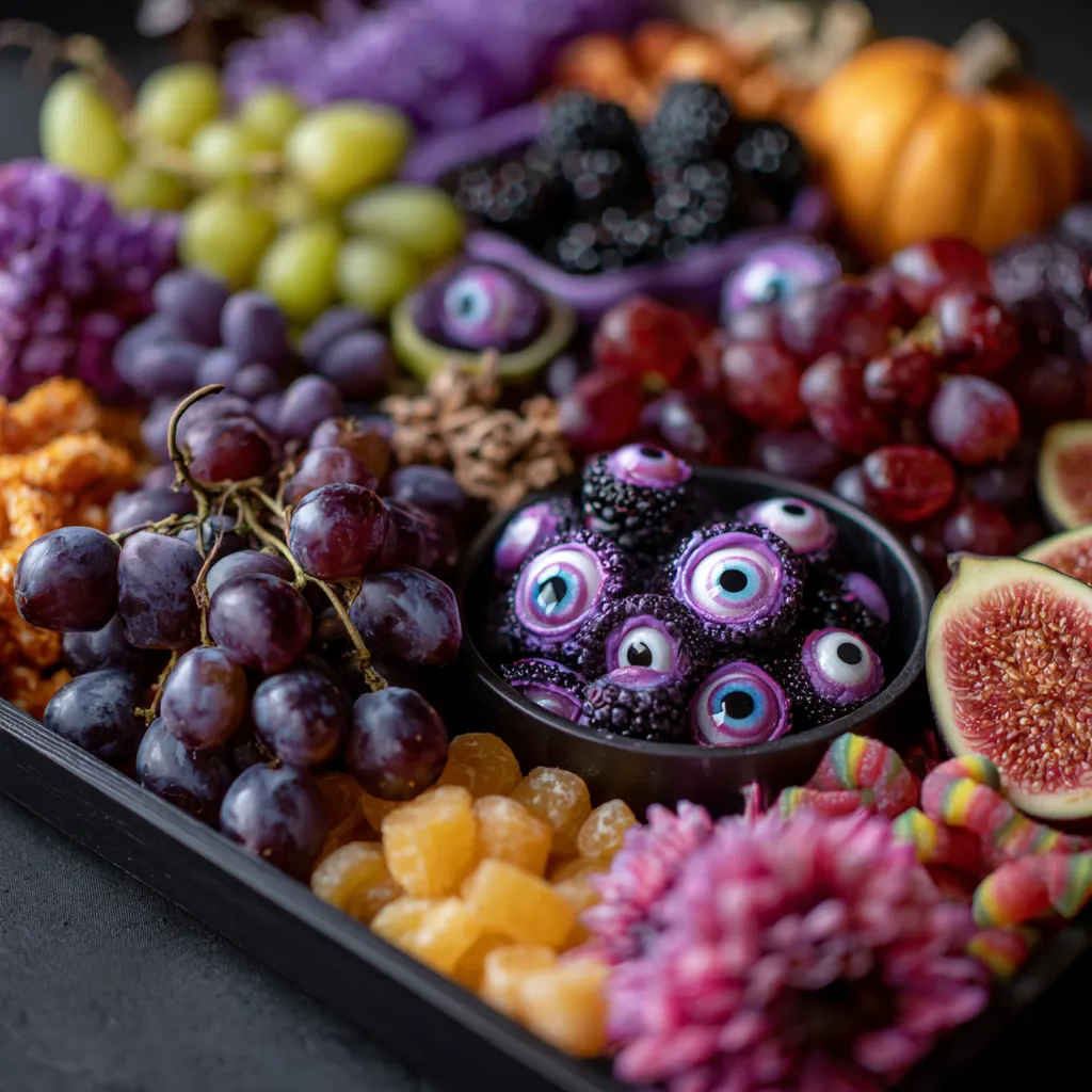 Place grapes, figs, strawberries, and dried fruit in the gaps. Add chocolate pretzels, candy eyeballs, or gummy worms for that magical Halloween touch.