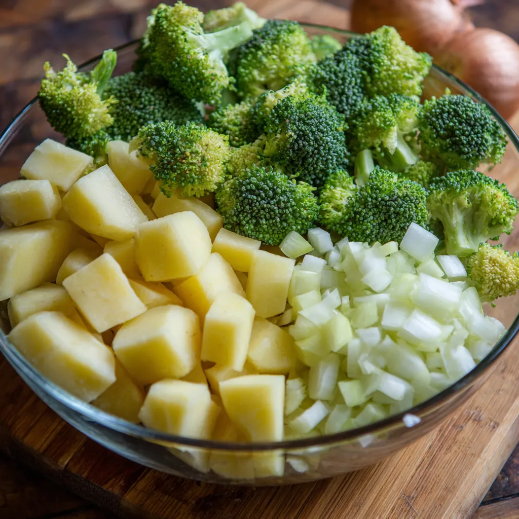 Start by peeling and chopping your potatoes into small cubes so they cook evenly. Then chop your broccoli into smaller florets. Finely dice the onion and mince the garlic.