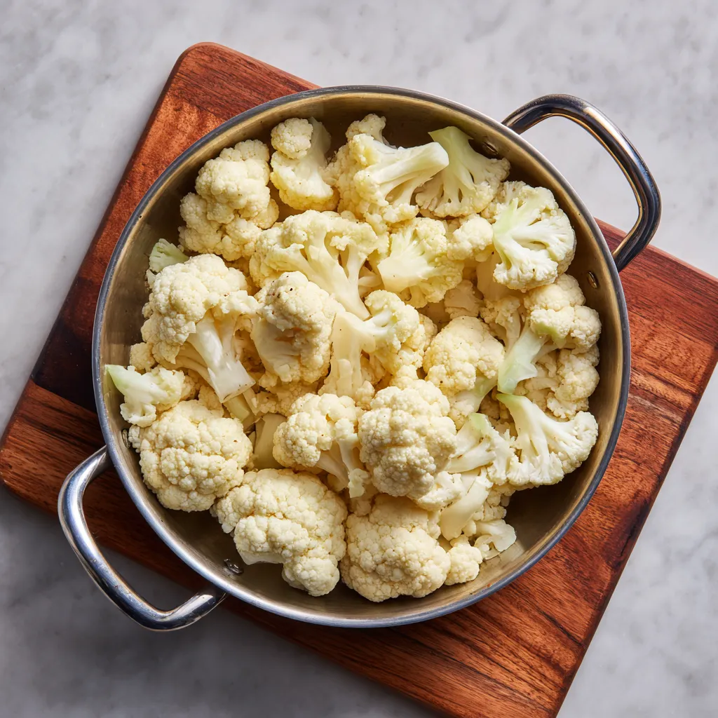 - Boil cauliflower florets 5–6 minutes, drain.