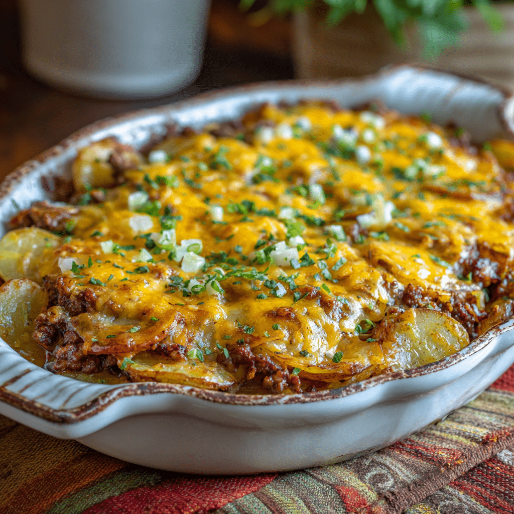 This cheesy ground beef and potato casserole is a warm, comforting family dinner made with simple ingredients. I layer tender potatoes, seasoned ground beef, and melted cheese, then bake everything until golden and bubbling. It’s hearty, satisfying, and perfect for cozy evenings.
