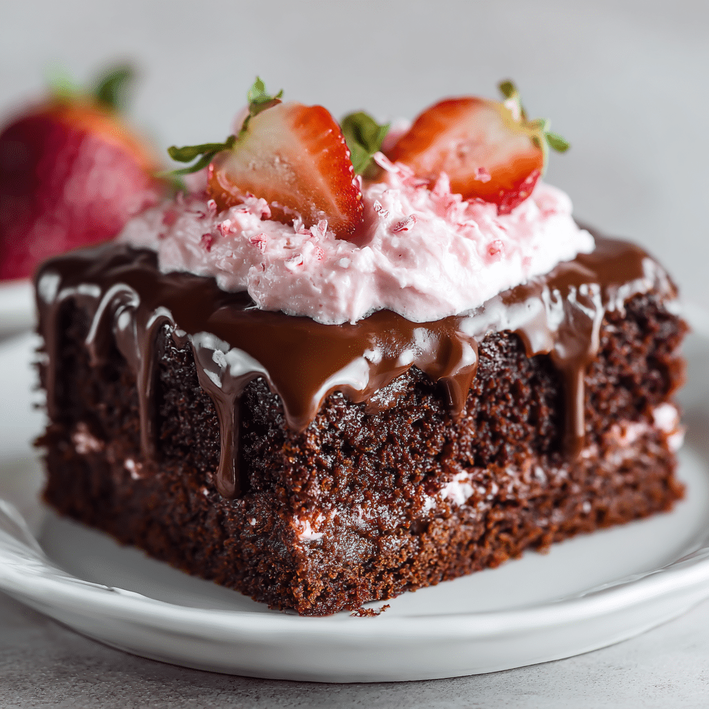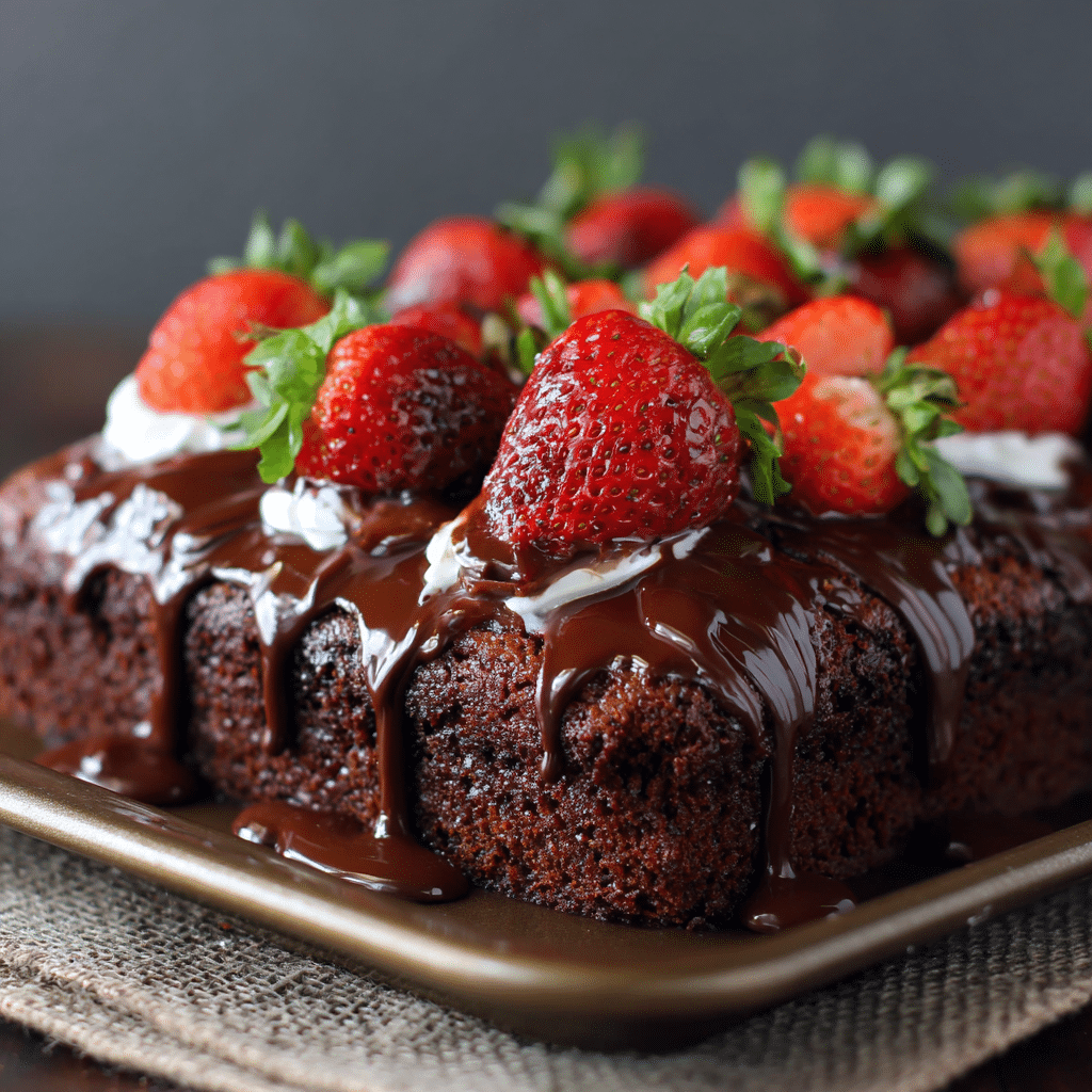 I make this Chocolate Strawberry Sheet Cake when I want something simple, rich, and beautiful. I bake a moist chocolate sheet cake using hot coffee to deepen the flavor. I top it with smooth dark chocolate ganache and sweet strawberries tossed with sugar and lemon juice. The cake stays soft and fudgy, while the strawberries add freshness and color. I serve it in generous squares for birthdays, family gatherings, or cozy afternoons with coffee. It stores well in the refrigerator and tastes even better the next day. This cake always brings smiles to my table.