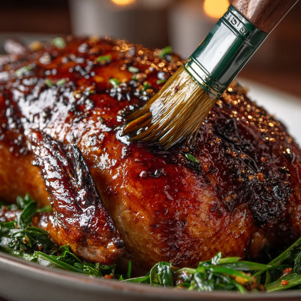 In the last 30 minutes of roasting, brush the duck with the honey-orange-soy-balsamic glaze. It gives the bird a glossy finish and a hint of sweetness that perfectly complements the savory stuffing.