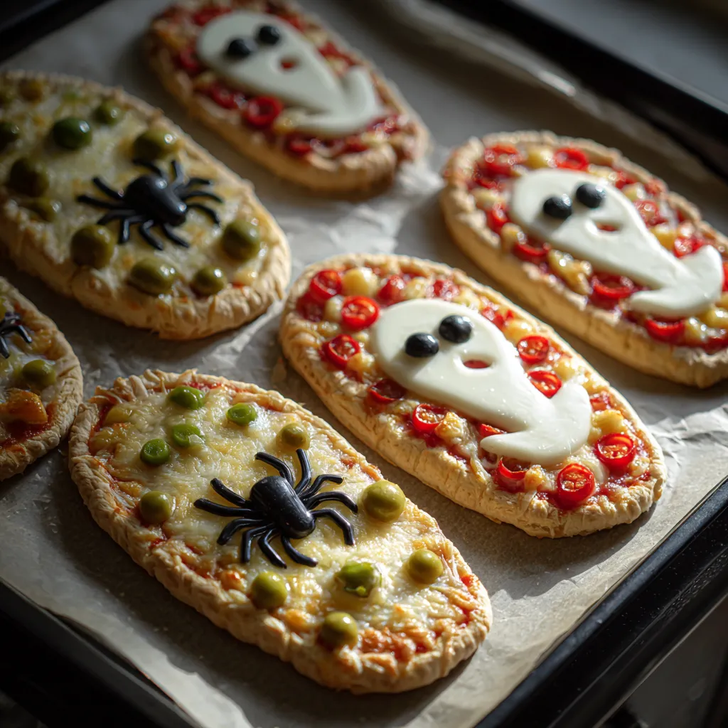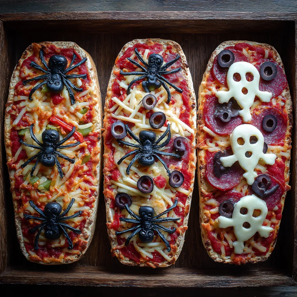 I love that this recipe mixes something familiar pizza with a creative twist. Instead of complicated dough, I use store-bought flatbreads, which saves time but still gives that homemade warmth. Then comes the fun: shaping them into coffins, adding sauce, cheese, and toppings, and decorating them with little “spooky” details like olive spiders, pepper “stitches,” or mozzarella “ghosts.”