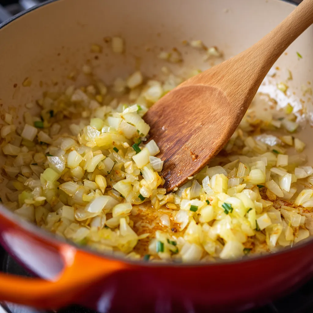 In a large pot, heat the olive oil over medium heat. Add the chopped onion and garlic. Sauté until the onions turn soft and golden. This is the flavor base let it build slowly.
