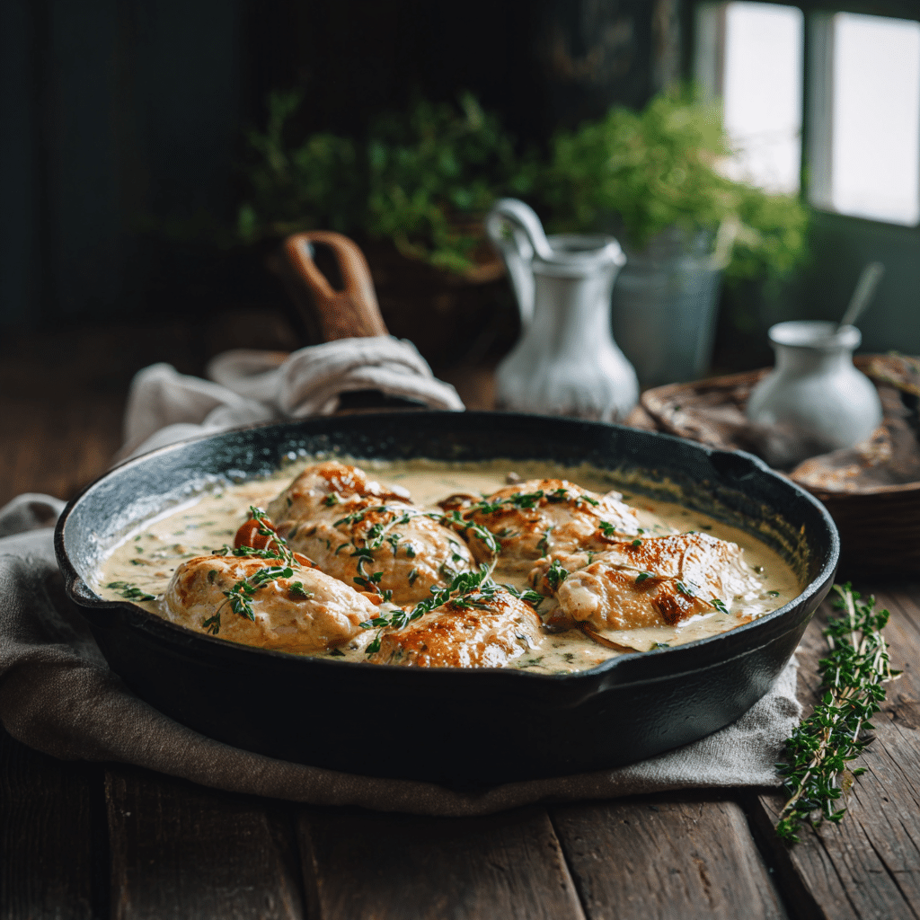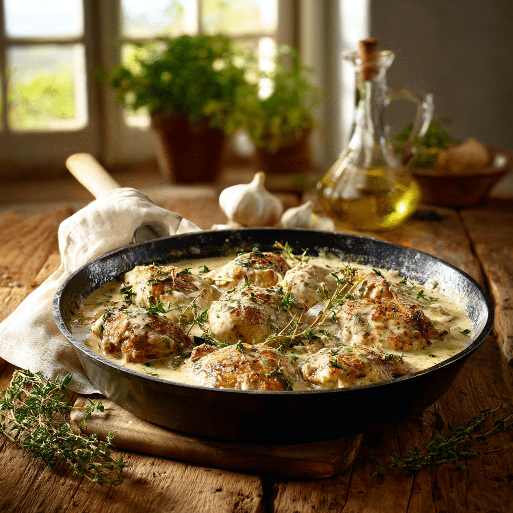 Chicken thighs, cream, garlic, onion, olive oil, herbs