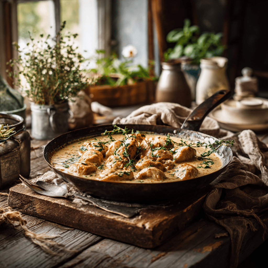 I remove the chicken and soften onions and garlic in the same pan. I scrape the bottom gently, letting all the good bits melt into the oil. Then I add cream, a splash of broth, and a little mustard. The sauce thickens softly, like a blanket.