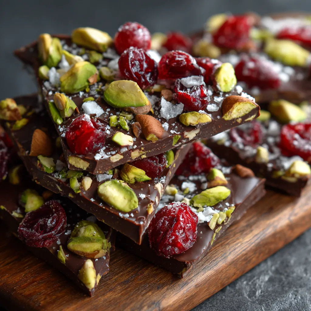 While the chocolate is still warm, sprinkle the dried cranberries and chopped pistachios evenly over the surface. Gently press them so they stick. Add a pinch of sea salt for balance. If adding extras like orange zest or a chocolate drizzle, now’s the time.
