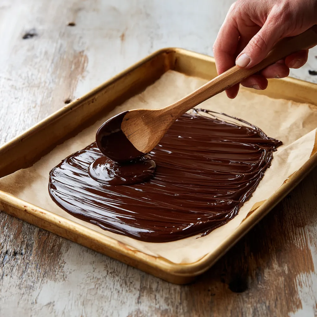Line a sheet pan with parchment paper. This makes it easy to lift the bark once it’s set. Pour the melted chocolate onto the paper and spread it evenly using a spatula, about ¼ inch thick.