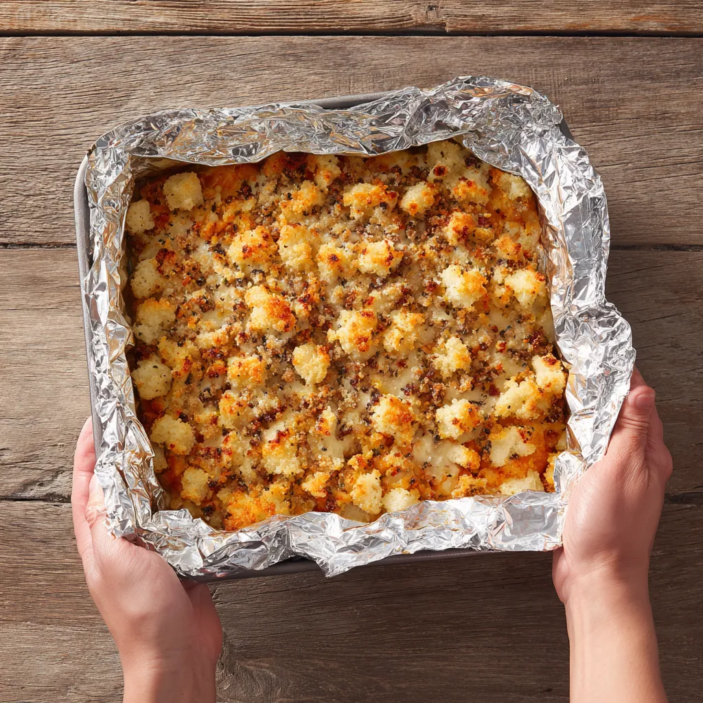 Transfer the mixture into a greased baking dish. Cover with foil and bake for 25 minutes. Then remove the foil and bake for another 15–20 minutes, until the top is golden brown and crisp.