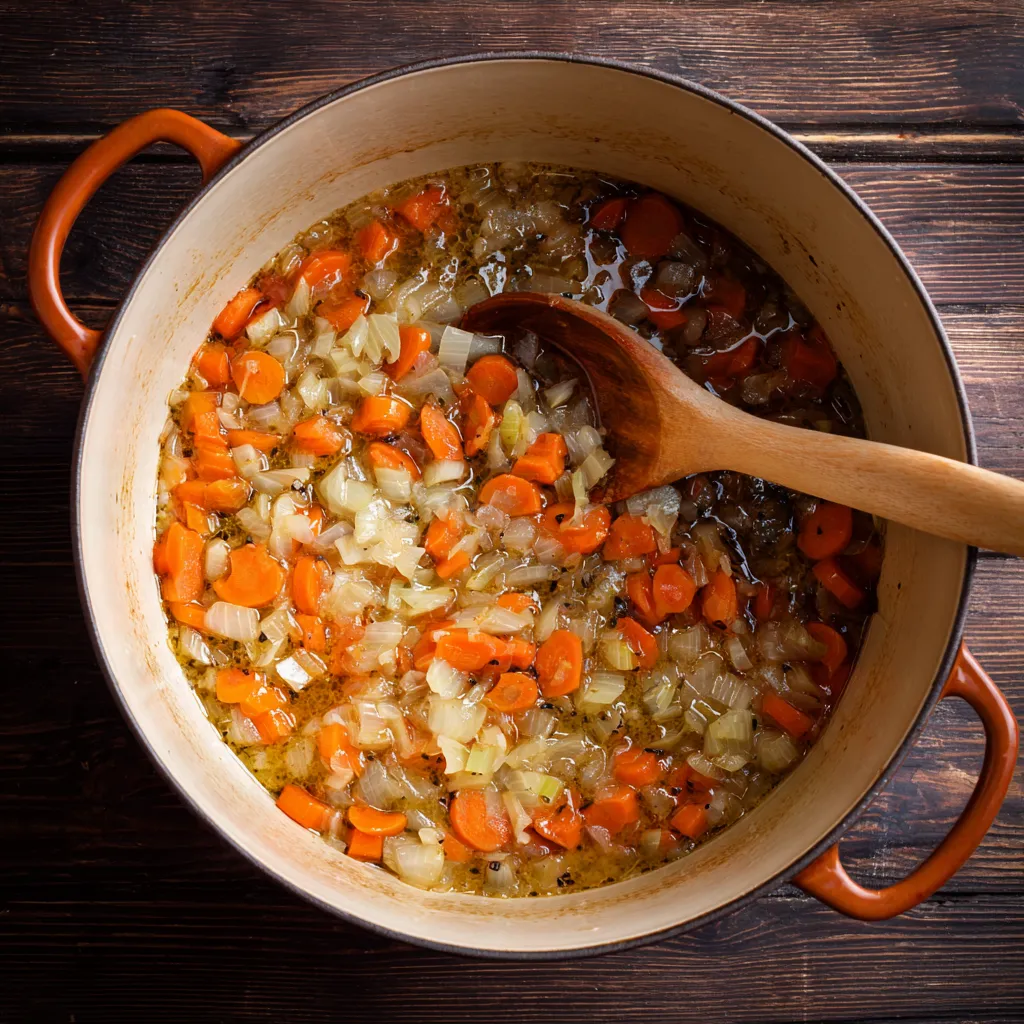 Heat olive oil or butter in a large pot over medium heat. Add the onion, carrot, and celery. Cook for 5–7 minutes until soft and fragrant. Add garlic and sauté for 1 minute more don’t let it brown.
