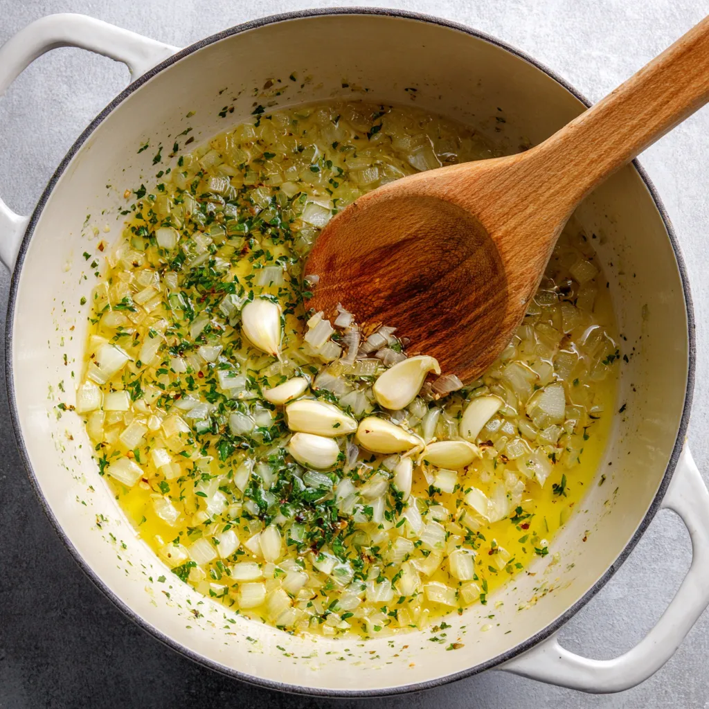 Heat the butter and olive oil in a large pot over medium heat. Add the onion and sauté until soft and translucent. Add the garlic and let it cook just until fragrant. This step builds the bold garlic base that makes this soup unforgettable.