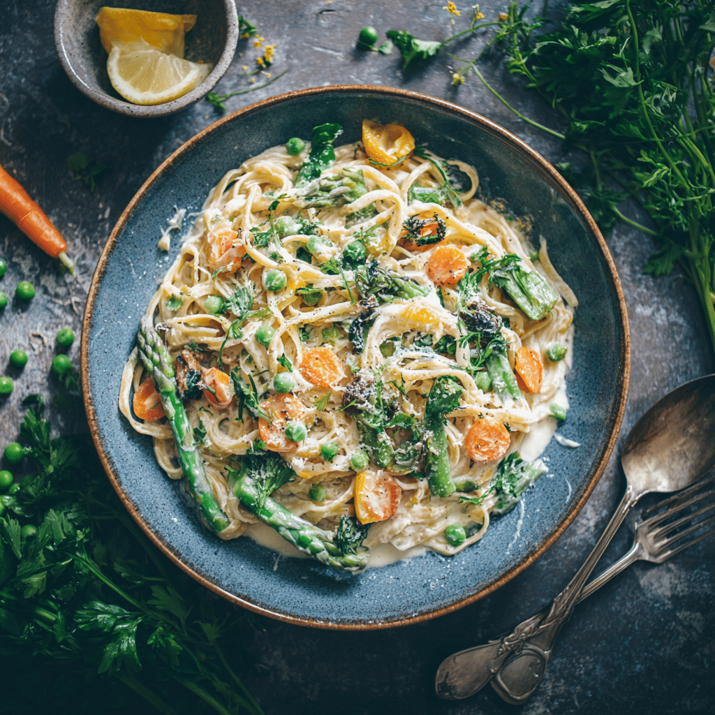 Creamy Pasta Primavera with Parmesan Sauce always reminds me that food does not need to be complicated to feel special. I grew up watching my grandmother cook with whatever vegetables the garden gave us that day. Zucchini, carrots, onions, sometimes peas or green beans nothing fancy, just honest ingredients handled with care. She taught me that vegetables shine brightest when we respect them, and pasta becomes magical when we treat the sauce gently.
