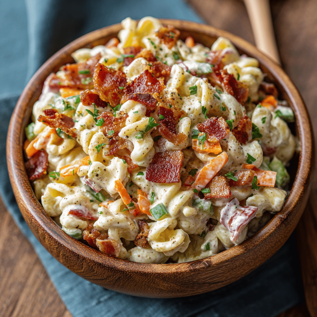 I always salt my pasta water generously. Pasta salad starts there. I also let the pasta cool slightly before mixing so the dressing doesn’t melt away. And I save a bit of bacon to sprinkle on top right before serving. That crunch matters.