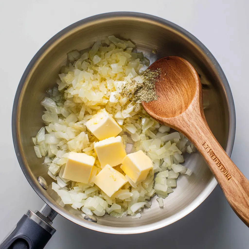 Melt the butter in a large pot over medium heat. Add the chopped onion and cook until soft and translucent. Stir in the garlic and cook for another minute until fragrant.
