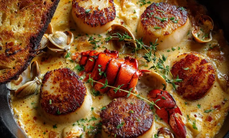 This dish is one of those recipes that feels special even before it hits the oven tender scallops, sweet lobster meat, and a silky cream sauce that bubbles into golden perfection. It’s the kind of meal you make for someone you adore… or when you feel like treating yourself like royalty.