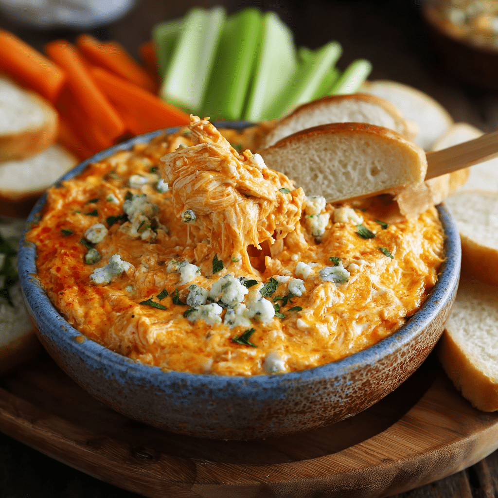 I use boneless, skinless chicken breasts because they shred easily and soak up flavor. I choose full-fat cream cheese because it melts smoother and creates a silkier dip. I trust buffalo sauce that balances heat and tang, not just fire. I add shredded cheese for richness and depth, and I never skip a little garlic because garlic brings soul.