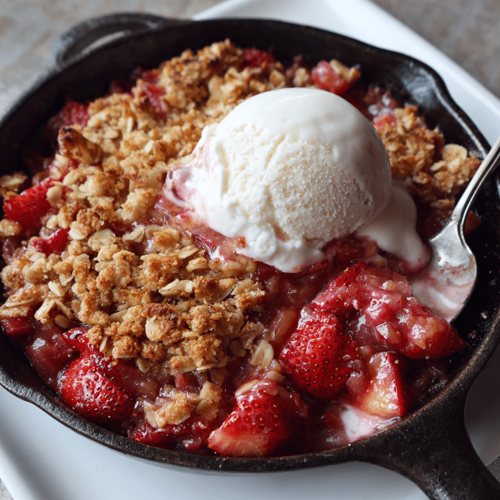 This Easy Strawberry Rhubarb Crisp is warm, bubbly, sweet, and gently tart with a buttery oat topping that turns golden in the oven. I love how simple this dessert feels—just fresh strawberries, bright rhubarb, and a cozy crumble that comes together quickly. It is perfect for spring and summer gatherings, family dinners, or any day when I want a comforting fruit dessert that tastes beautiful with vanilla ice cream or whipped cream.