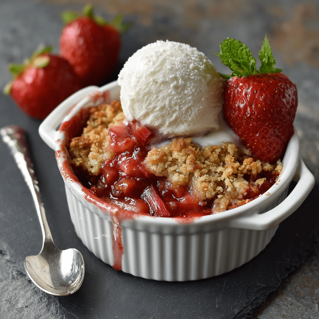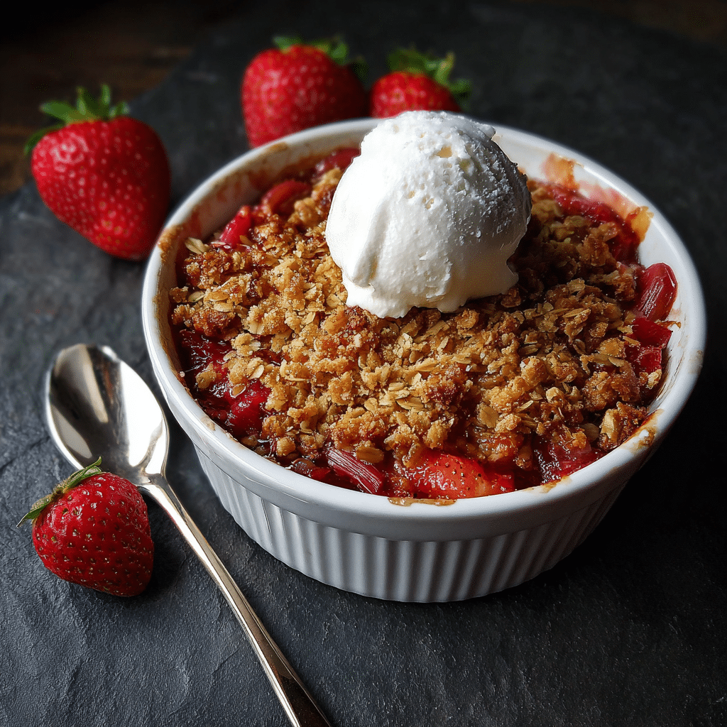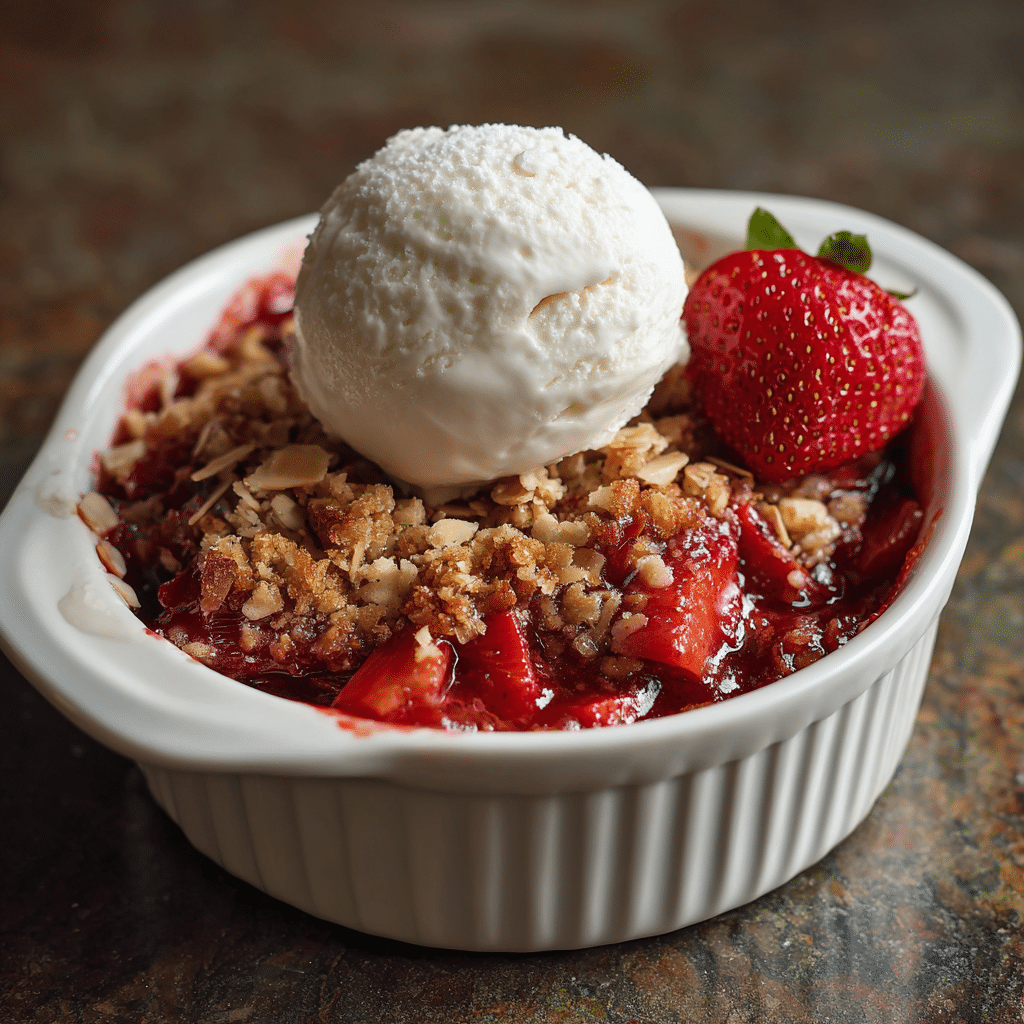 A warm and comforting strawberry rhubarb crisp made with fresh fruit and topped with a buttery oat crumble. This classic dessert combines sweet strawberries and tart rhubarb baked together until bubbling and golden.