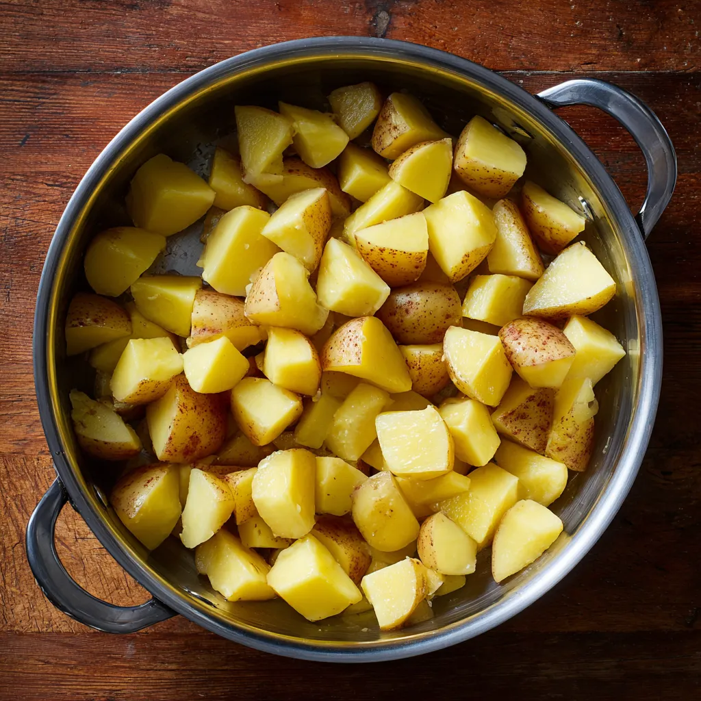 Peel your potatoes and cut them into equal-sized chunks about 1½ inches each. This ensures they cook evenly. Place them in a large pot, cover with cold water, and add a generous pinch of salt.