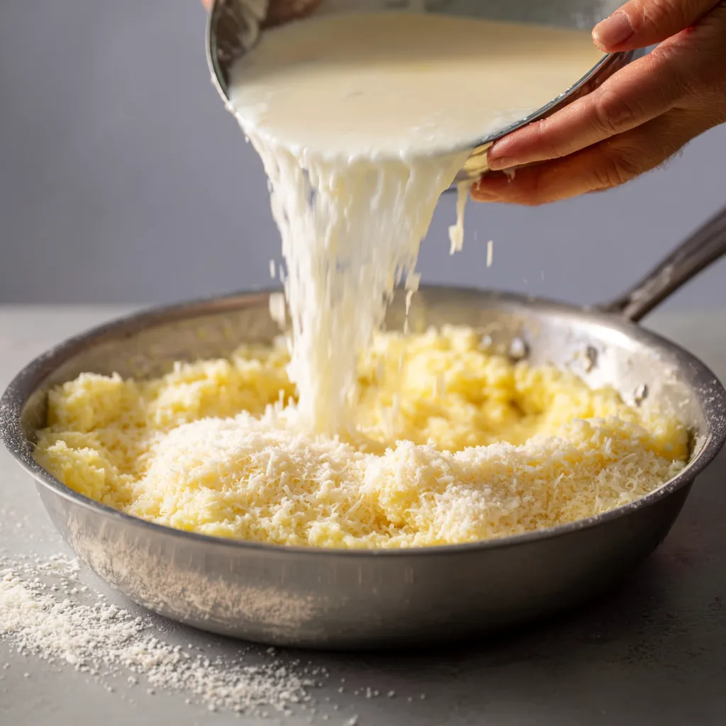 Slowly pour in the warm cream and milk mixture, stirring as you go. Then, add the Parmesan cheese and olive oil. Keep mashing and mixing until the potatoes reach your desired texture smooth and fluffy.