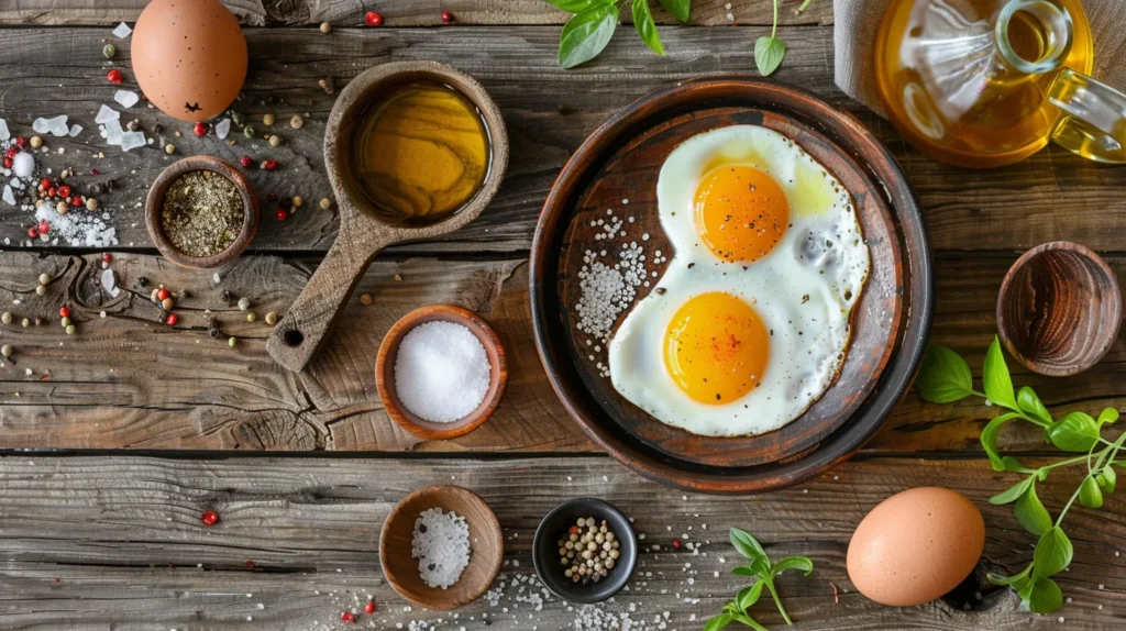 “Flat lay of ingredients for ghost-shaped sunny-side eggs: fresh eggs, small olive oil dish, pinch of salt and pepper in tiny bowls, playful Halloween-themed kitchen props, bright natural light, rustic wooden background –ar 16:9 –v 6 –q 2”