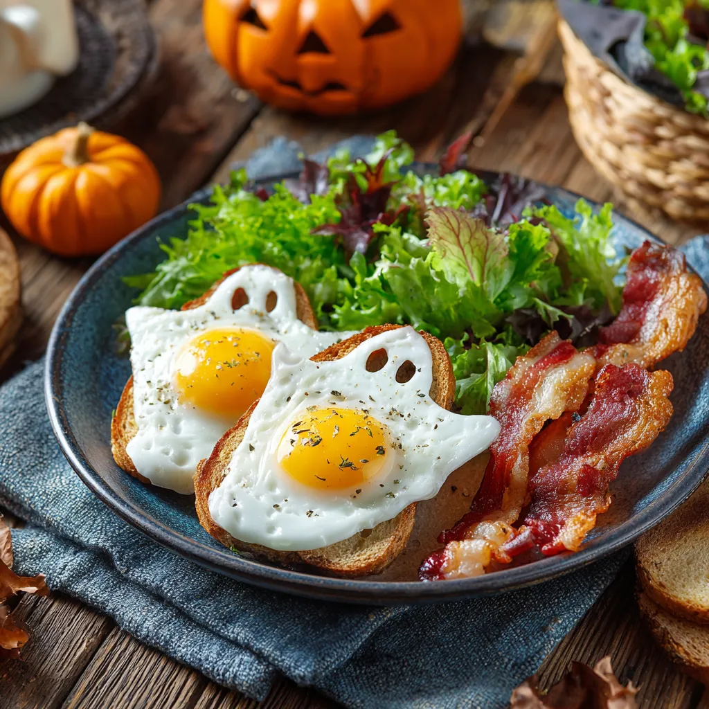 - Description: A styled recipe card for ghost-shaped sunny-side eggs with playful ghost design.