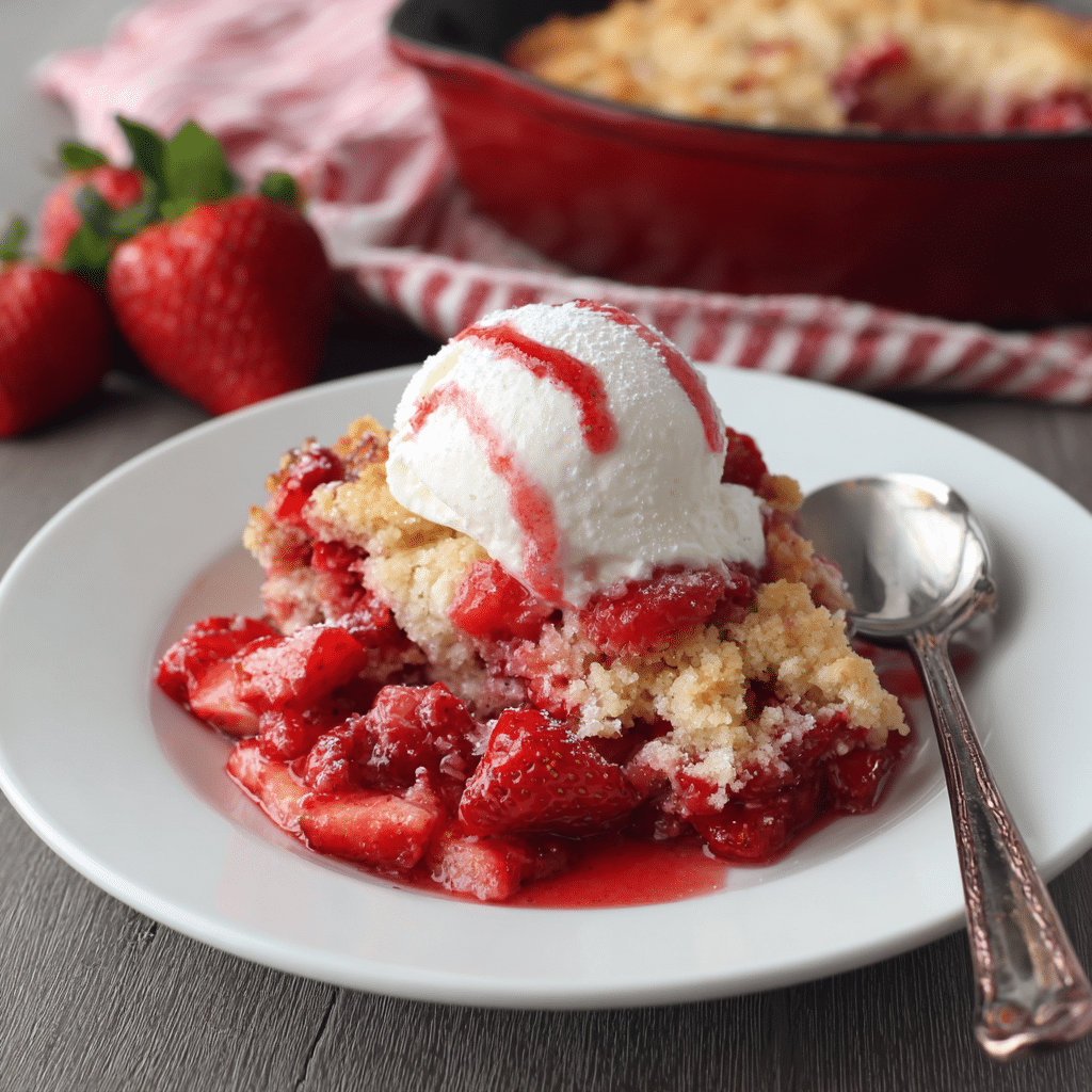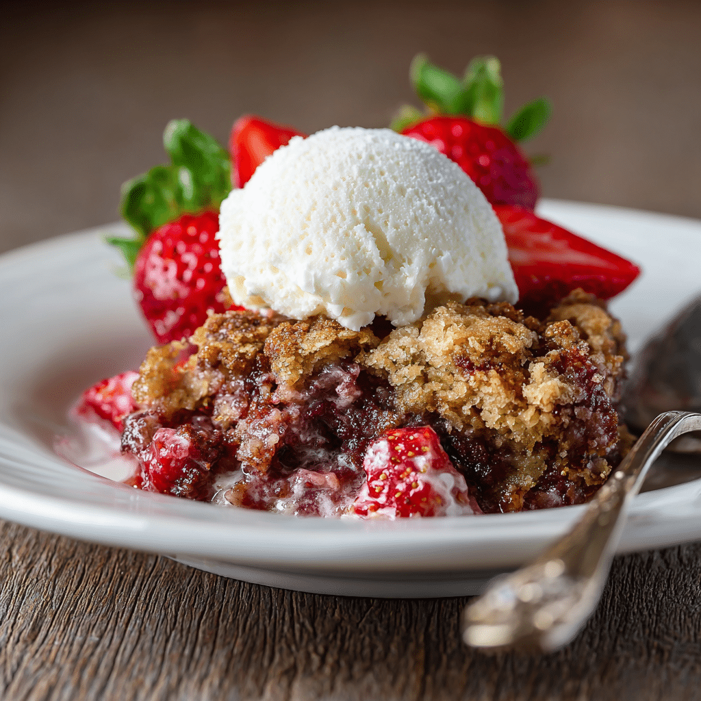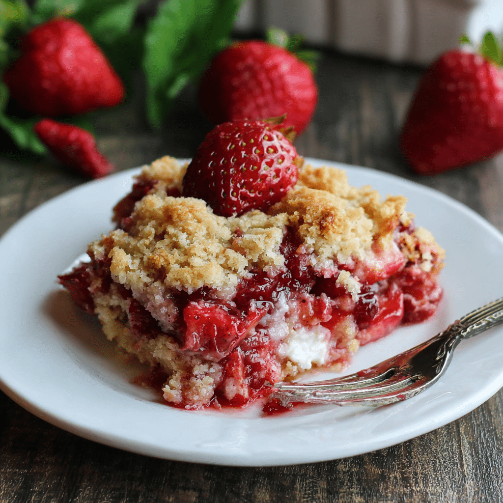 Use ripe, fragrant strawberries for the best flavor. If using frozen strawberries, thaw completely and drain well to prevent a watery filling. For extra crunch, sprinkle 1/4 cup chopped almonds or pecans over the buttered cake mix before baking. Store leftovers covered in the refrigerator for up to 4 days. Reheat in the microwave for 30–45 seconds or warm in a 300°F (150°C) oven for 10–15 minutes. You can also assemble the dish a few hours ahead and bake right before serving.