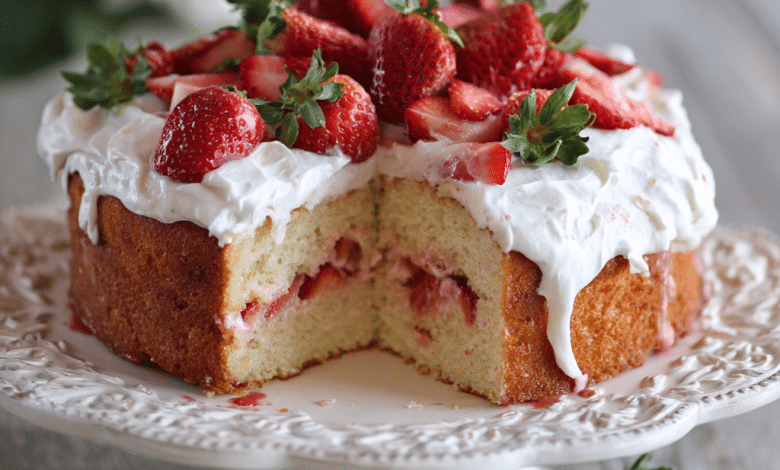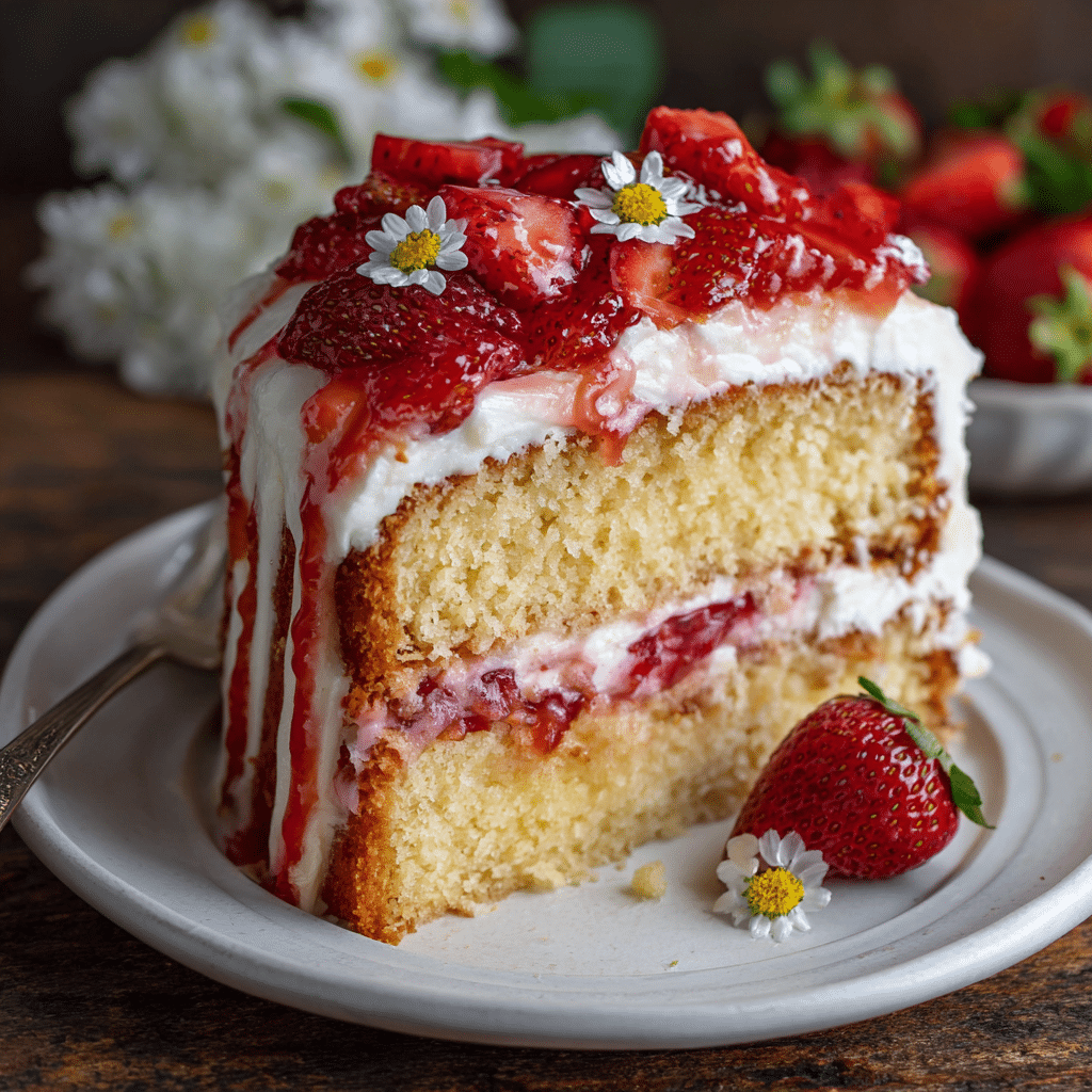 Pat the strawberries dry before adding them to the batter to prevent a soggy crumb. Use a gluten-free flour blend that contains xanthan gum for the best structure. Mix gently and stop as soon as the batter looks smooth—overmixing can make gluten-free cakes dense. Make-ahead tip: bake the cake layer 1 day in advance and wrap tightly at room temperature; whip the cream and top right before serving. Storage: keep leftovers covered in the refrigerator for up to 3 days. Freezing: freeze the undecorated cake layer (wrapped well) for up to 2 months, then thaw and top fresh.
