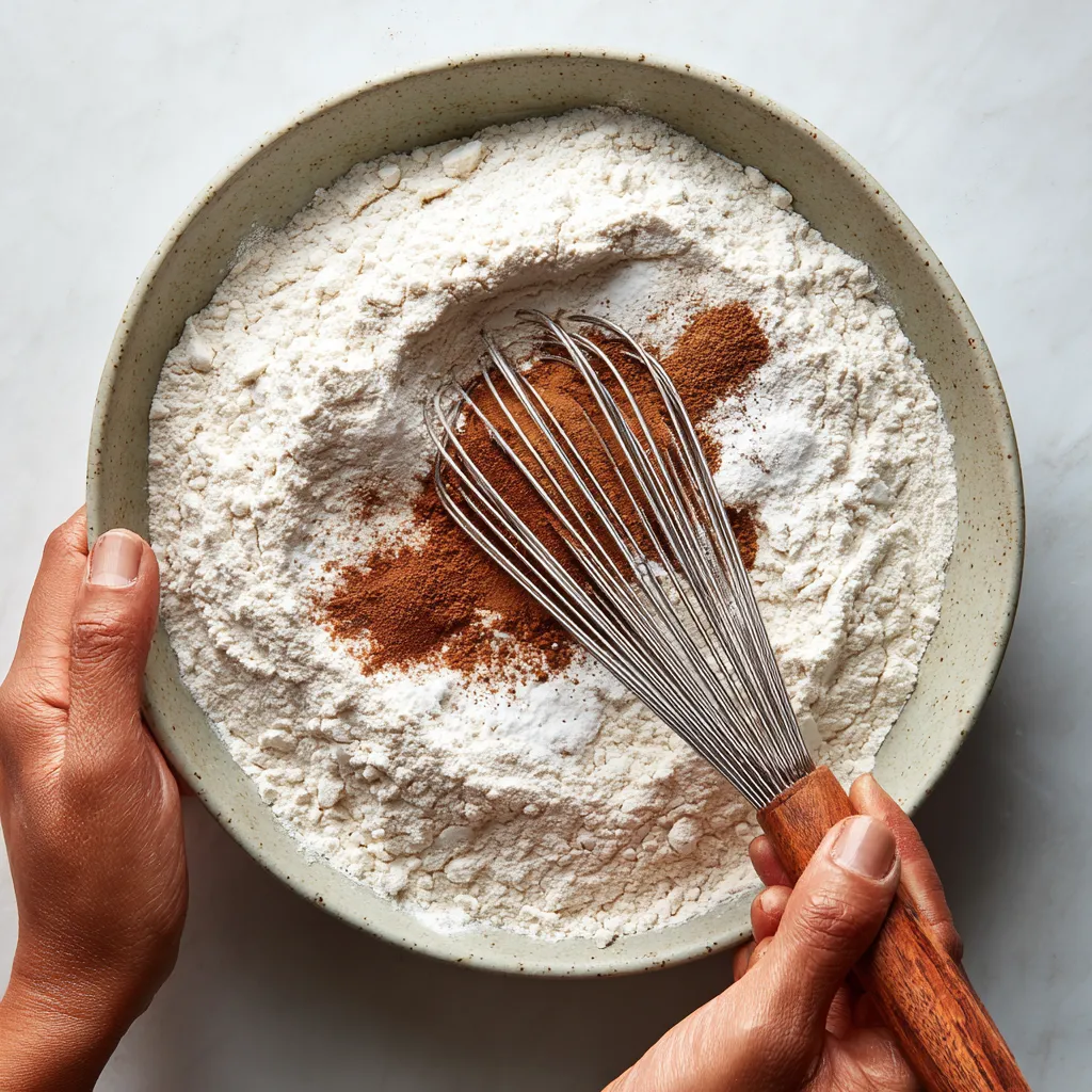 In a large bowl, whisk together flour, baking soda, baking powder, salt, cinnamon, nutmeg, and cloves. This step ensures even distribution of spices no clumpy surprises later!