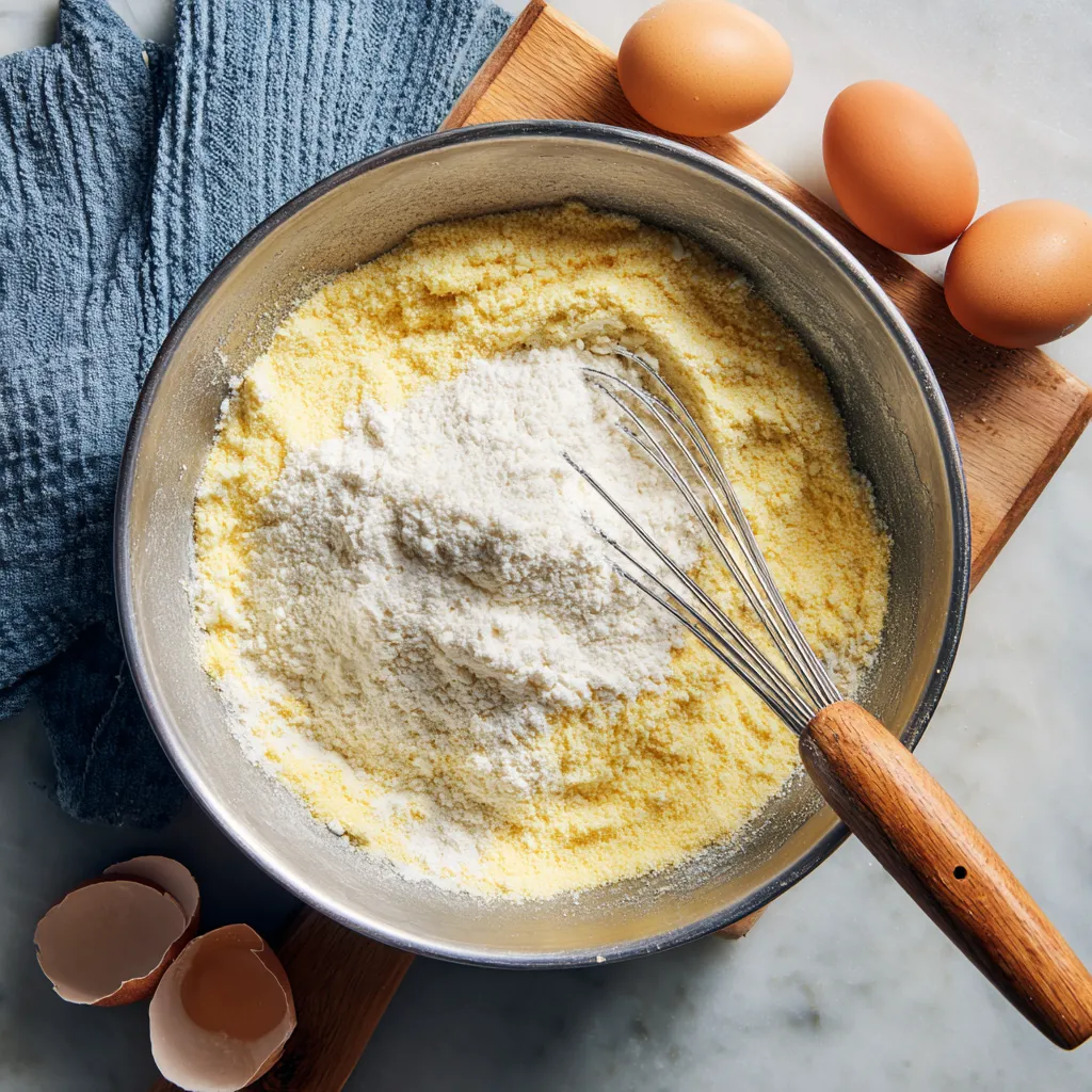 In a large bowl, whisk together the cornmeal, flour, baking powder, salt, and sugar. Mixing the dry ingredients first ensures even texture and perfect fluffiness.