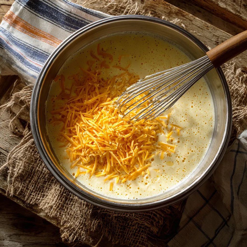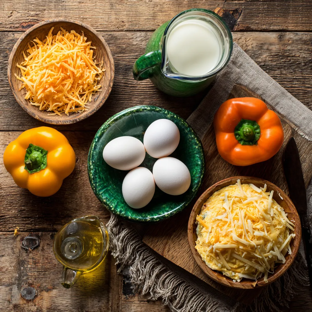 In a medium bowl, whisk together eggs, milk, salt, and pepper until fluffy. Stir in shredded cheddar cheese and any optional fillings like spinach or diced ham.