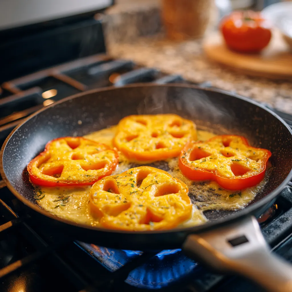Heat olive oil or butter in a nonstick skillet over medium heat. Place the bell pepper cutouts in the skillet and pour the egg mixture around and slightly inside them. Cook gently until the eggs set, about 3–5 minutes. Flip carefully if needed, or cover with a lid to finish cooking.