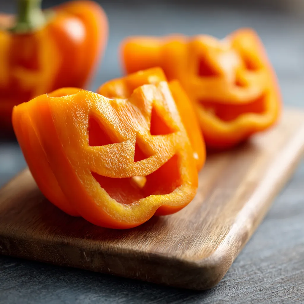 Slice the orange bell pepper horizontally into thick rounds (about ½ inch). Use a small paring knife to carve out jack-o’-lantern faces—triangle eyes and a jagged smile. For a festive touch, cut small pieces of green bell pepper to act as stems.