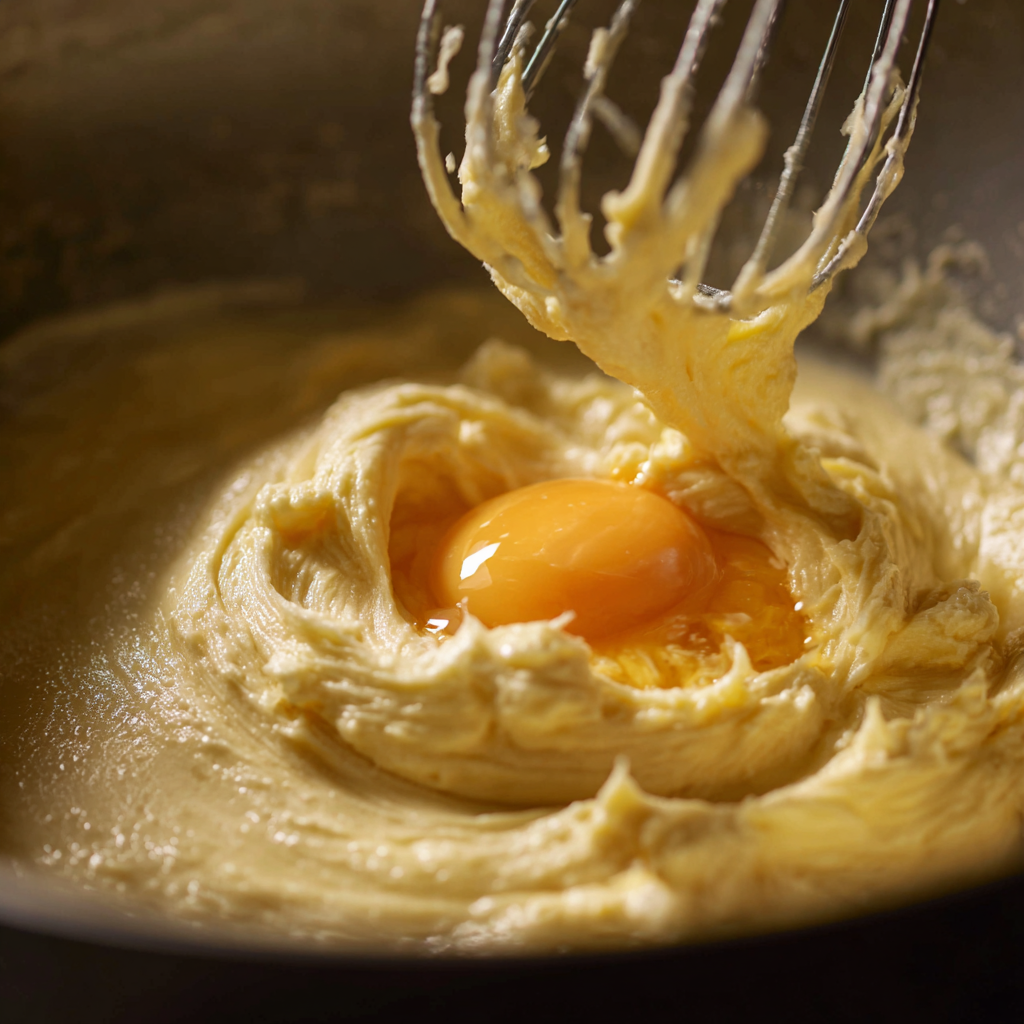 Mix in the eggs, one at a time, followed by vanilla extract. Don’t overmix; just combine until smooth.