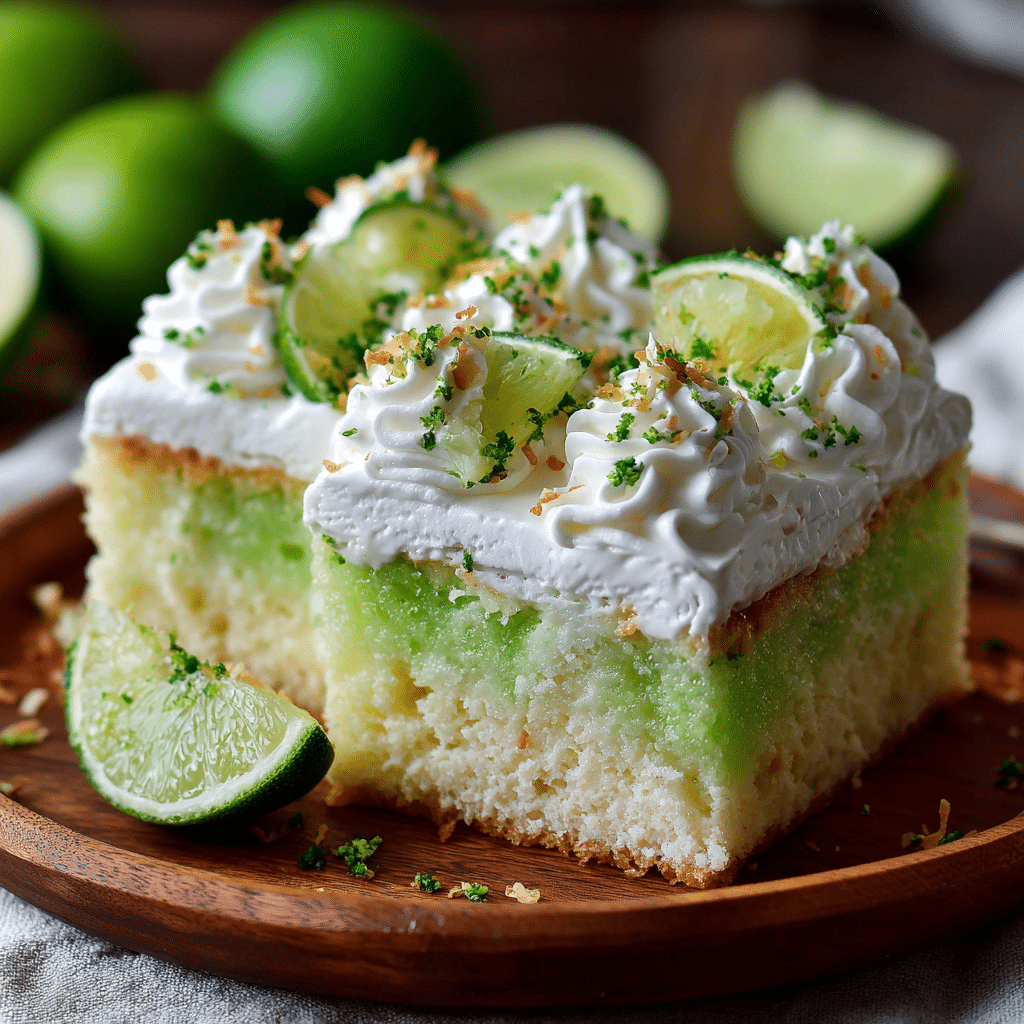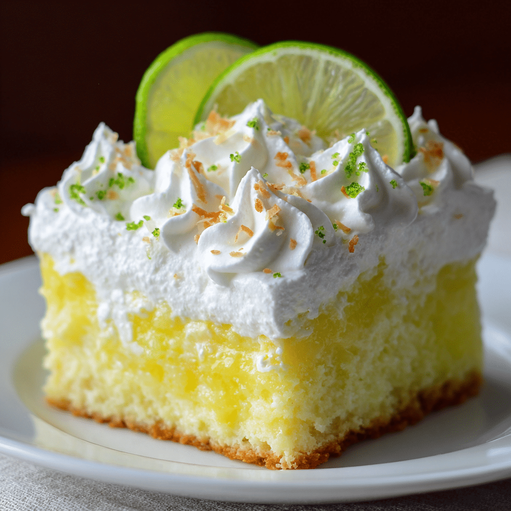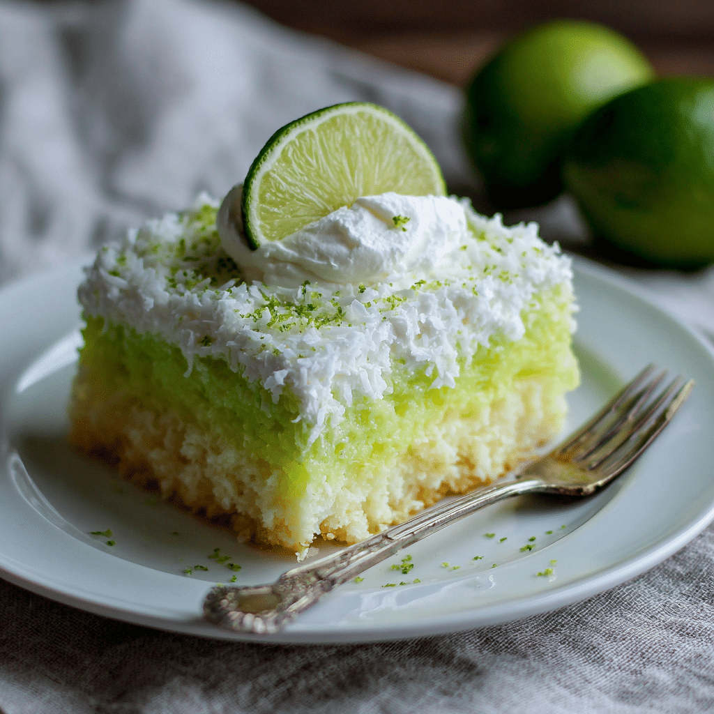 For the fluffiest topping, chill the coconut milk overnight and use a cold bowl and beaters. I use whole milk in the cake batter to keep the cake extra soft. I pour the gelatin slowly so it fills the holes evenly. This cake tastes even better the next day, so I often make it ahead. Store covered in the refrigerator for up to 4 days. I avoid freezing because gelatin can change texture after thawing. For a stronger lime flavor, add extra lime zest to the batter or a little more lime juice to the gelatin (but keep the liquid amounts balanced so it sets well).