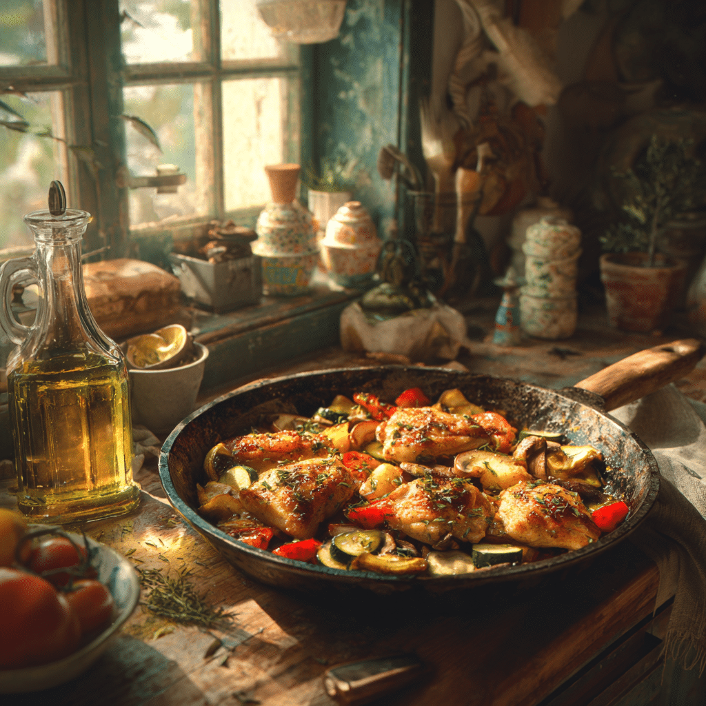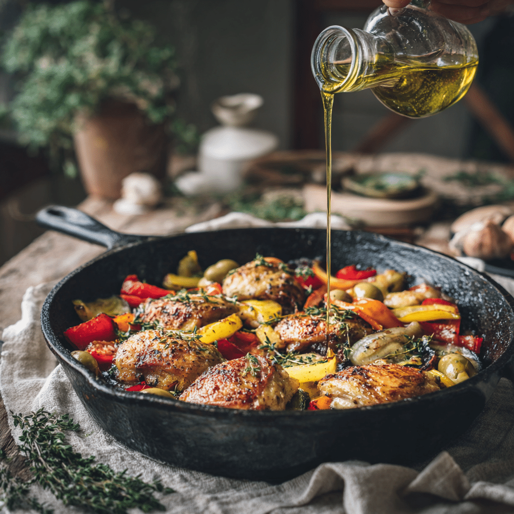 I heat my pan gently and add olive oil. I let the oil warm slowly so it doesn’t burn. I season the chicken well and cook it until golden, not rushed. I remove it and let it rest so the juices stay inside.