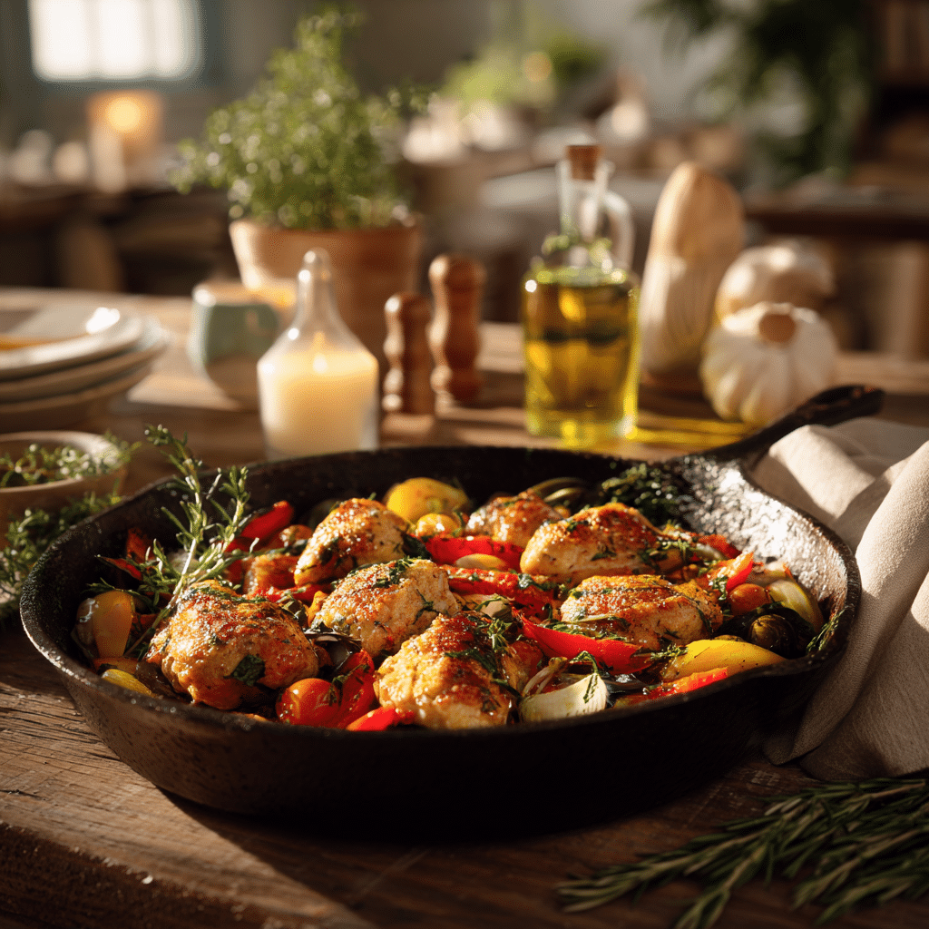 I cook the vegetables in the same pan so they absorb all the flavor. I add garlic, herbs, and a little lemon zest. I return the chicken, let everything come together, and finish with fresh herbs.
