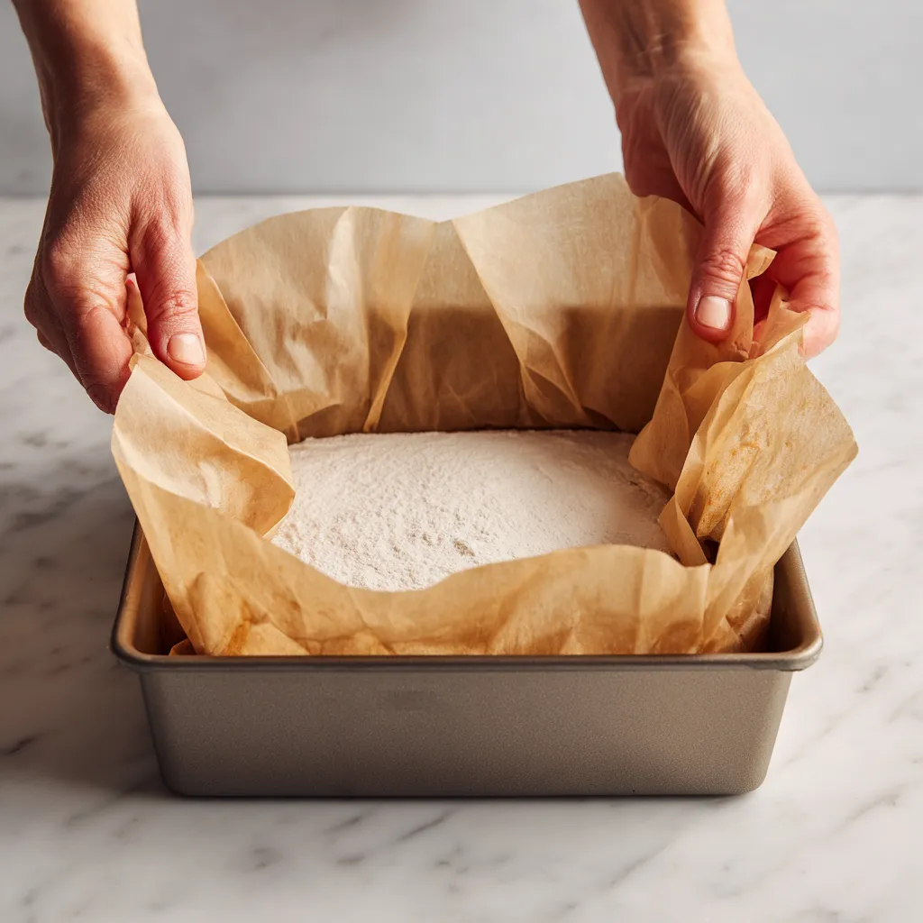 Set your oven to 325ยฐF (160ยฐC) and line an 8×8-inch baking pan with parchment paper, leaving a little overhang for easy removal later.