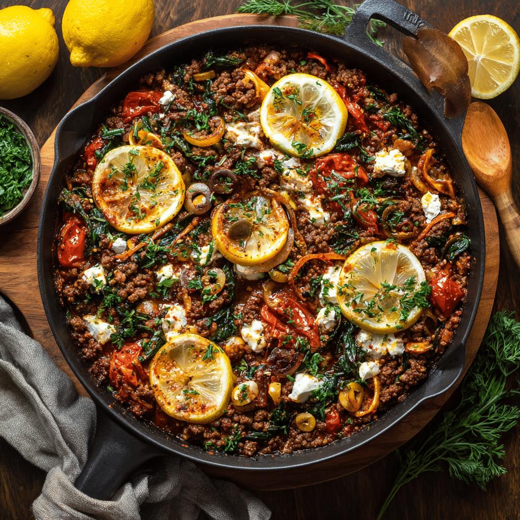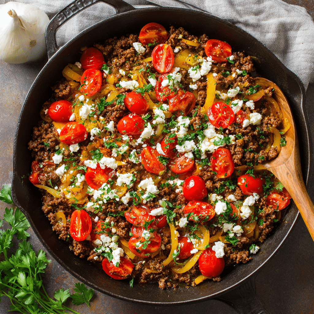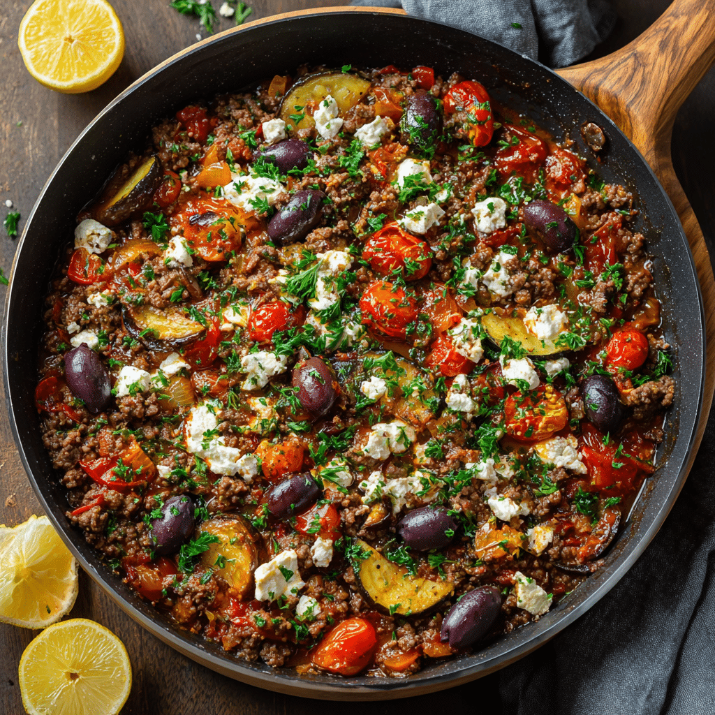 This Mediterranean Ground Beef Skillet is a cozy, one-pan dinner filled with olive oil, tomatoes, herbs, and comforting flavors. I brown ground beef with onions and garlic, then simmer it with Mediterranean spices and tomatoes until rich and fragrant. I finish with olives, fresh herbs, and lemon for brightness. It’s easy, flexible, and perfect for busy nights or family gatherings. I serve it with rice, pita, or salad, and it stores beautifully for leftovers. This recipe brings warmth, simplicity, and love to the table every time.