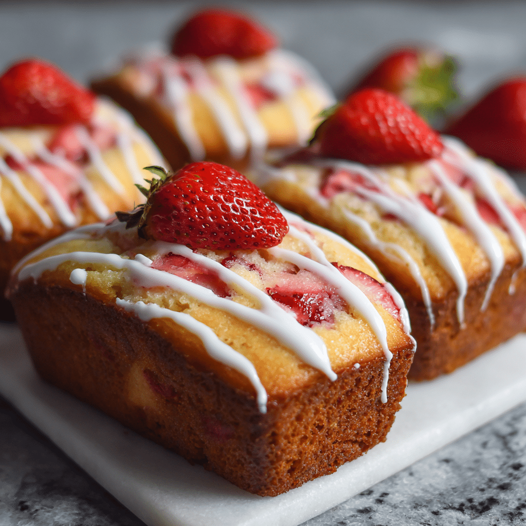 Mini Strawberry Pound Cake Loaves are soft, buttery mini cakes filled with fresh strawberries. I cream butter and sugar, add eggs and vanilla, then mix in flour and milk. I fold in flour-coated strawberries to prevent sinking. I bake the batter in mini loaf pans until golden and tender. These small cakes feel perfect for gifting, brunch, or afternoon coffee. I sometimes drizzle a light glaze on top for extra sweetness. They store well, freeze beautifully, and always bring smiles. This simple recipe creates moist, flavorful strawberry pound cake in charming individual portions.