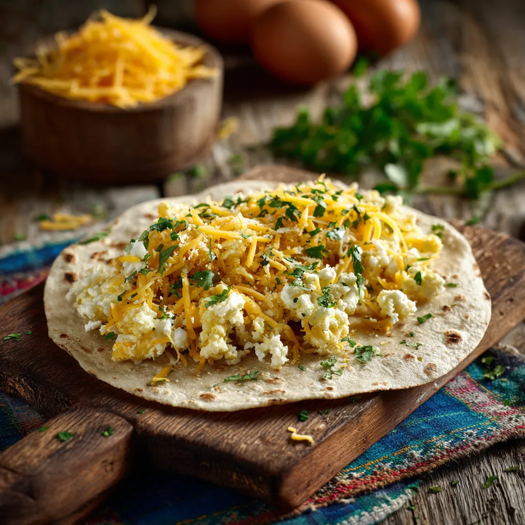Lay a tortilla flat and place scrambled eggs in the center. Sprinkle shredded cheese on top.