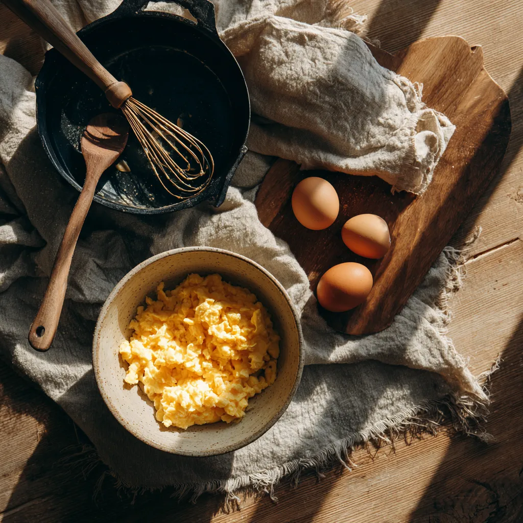 Crack the eggs into a bowl, whisk with milk, salt, and pepper until smooth. Heat butter in a pan, pour the egg mixture, and gently scramble until fluffy. Remove from heat and set aside.