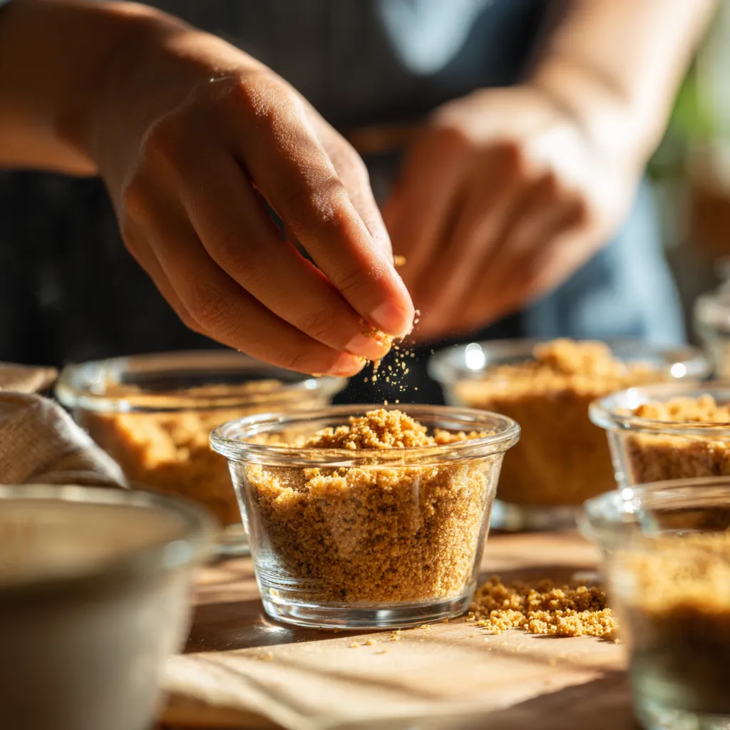 In a bowl, combine the crushed graham crackers, melted butter, and sugar. Mix until the texture resembles wet sand. Spoon about 2 tablespoons of the mixture into each cup or small glass jar, pressing it down gently with the back of a spoon to form a compact crust.