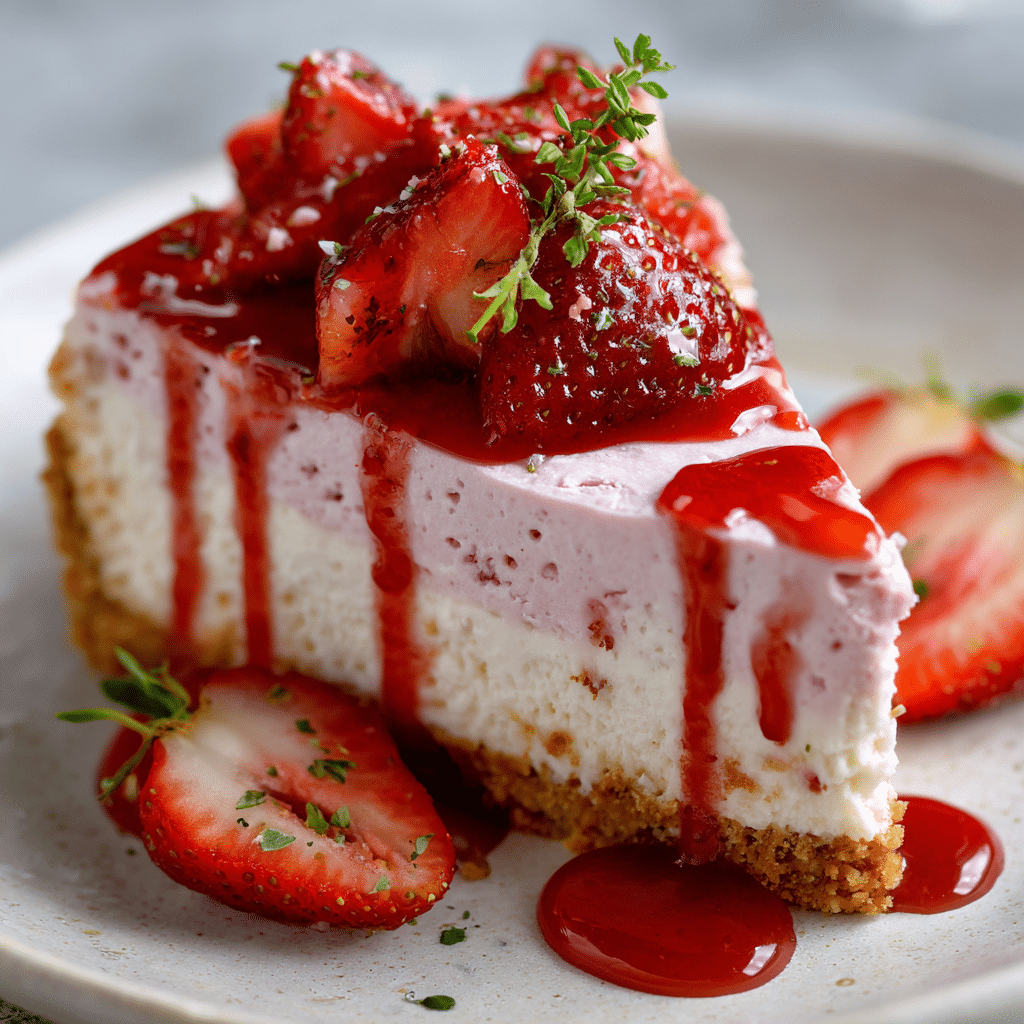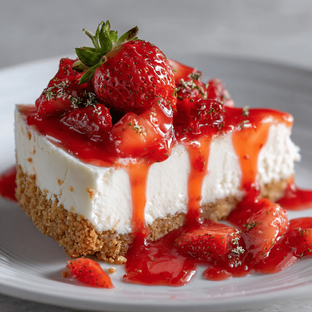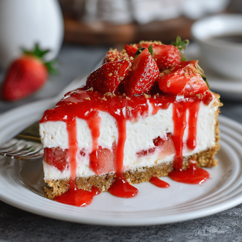 I make this No-Bake Strawberry Cheesecake with Sauce using crushed digestive biscuits mixed with melted butter for the base. I beat cream cheese with powdered sugar, vanilla, and lemon juice, then fold in whipped cream for a light filling. I spread the mixture over the chilled base and refrigerate for at least 4 hours. I cook fresh strawberries with sugar and lemon juice to create a glossy sauce, cool it completely, then spoon it over the cheesecake. I slice and serve chilled. This easy dessert feels creamy, fresh, and perfect for warm days or special gatherings.