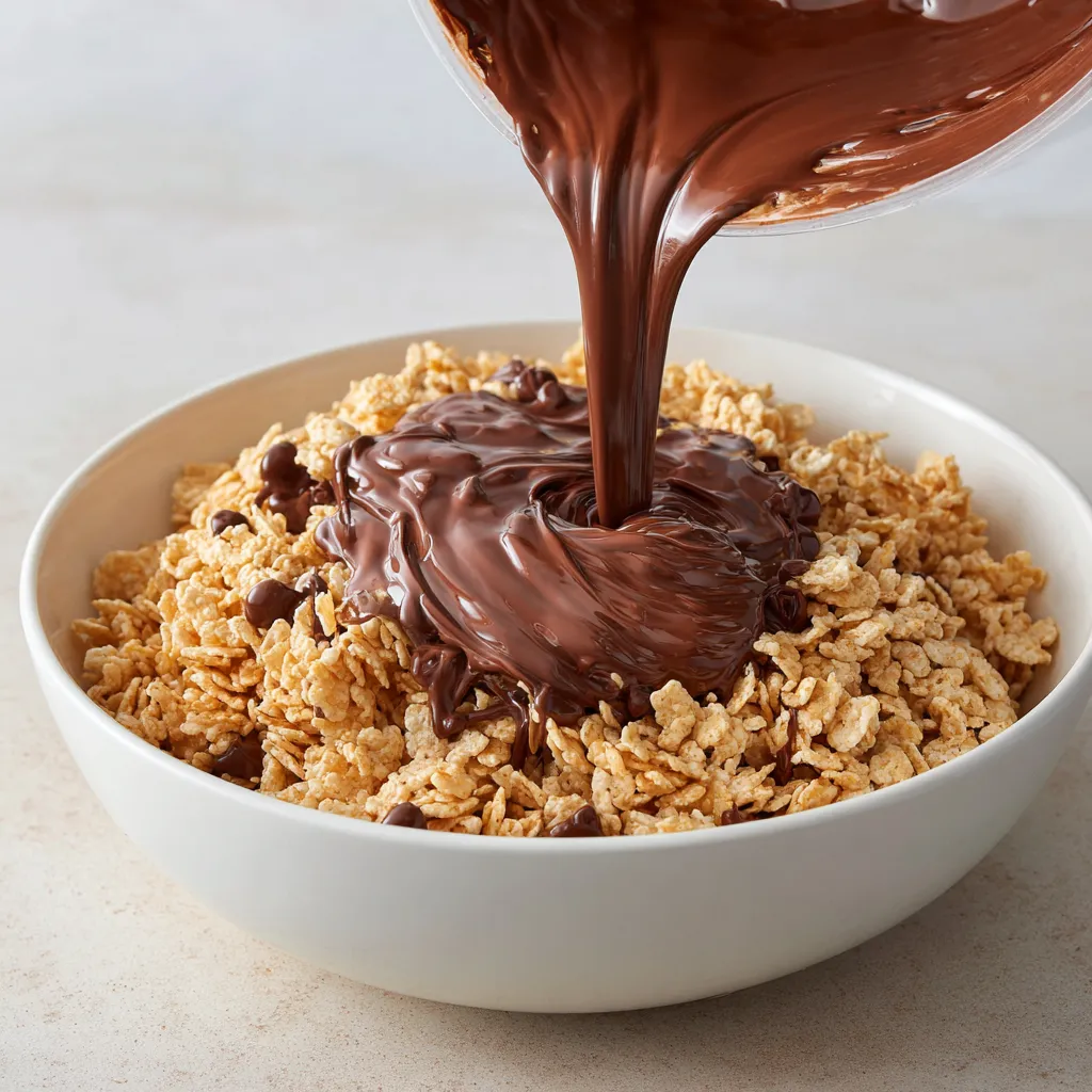 Pour 8 cups of cereal into a very large bowl. Drizzle the melted chocolate over the cereal and gently fold until every piece is coated.
